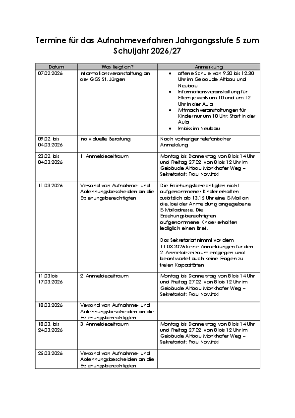 2. Anmeldung: die Termine für das Schuljahr 2026/2027 entnehmen Sie bitte der Übersicht