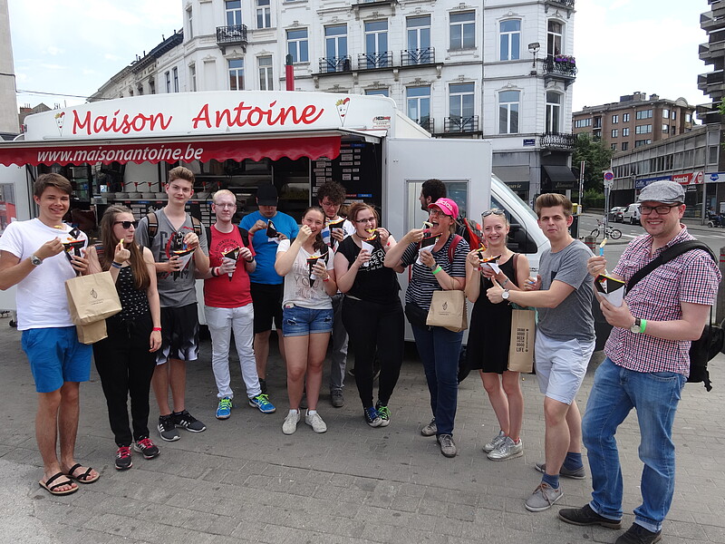 Die Crux an einer Reise in eine Metropole wie Brüssel ist, dass, sollte man jemals in die Situation kommen schriftlich, mündlich, oder telepathisch von dieser Reise zu berichten, man niemals in der Lage sein wird, dem Reiseziel in seinen Ausführungen gerecht zu werden. Deshalb bleibt dieser Bericht beschränkt auf die Kuriositäten die Brüssel, die „Hauptstadt Europas“, zu bieten hat. Die wohl augenfälligste davon ist meiner Meinung nach die Zweisprachigkeit dieser Stadt: In Belgien sind sowohl Französisch(das von den Wallonen gesprochen wird) als auch Niederländisch (das von den Flamen gesprochen wird) Amtssprachen. In der Praxis bedeutet das, dass selbst die Straßenschilder zweisprachig sind. Da ich den Klang des Straßennamens nicht textlich wiedergeben kann, behelfe ich mich für ein Beispiel anders: Hier hätten wir die „Rue de Chardons“ und auf flämisch steht darunter: „Distelstraat“. Sie erkennen den Unterschied? Eine zweite interessante Eigenart in Brüssel ist, dass man rund um einen Marktplatz mit einer Frittenbude, an den Cafés und Restaurants Schilder lesen konnte, die besagten „Fritten erlaubt“. Es ist also gestattet, sich mit seiner Pommestüte in die gemütlichen Stühle und unter den wohltuenden Schatten eines Sonnenschirms in ein Café zu flüchten(was eigentlich eine gute Geschäftsidee ist, bedenkt man, wie durstig man nach einer Tüte Fritten wird.) Doch auch im Rest der Stadt scheint es völlig legitim, sich vor ein Lokal zu setzten und dort in aller Ruhe eine mitgebrachte Brüsseler Waffel zu verspeisen.